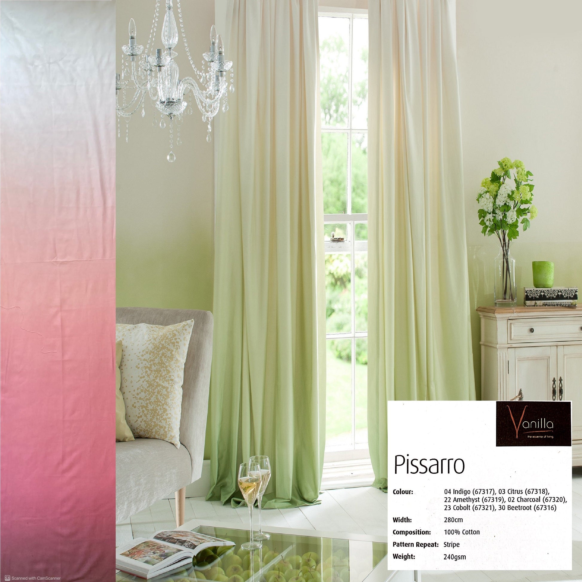 Pissarro Azelea by Pavillion is a colour graduated 280cm fabric from its base colour (Dark Dusty Pink) through to White and the graduation can either be used in curtains from side to side or top to bottom (as long as the drop is less than 260cm) to create a modern, unusual and unique look.